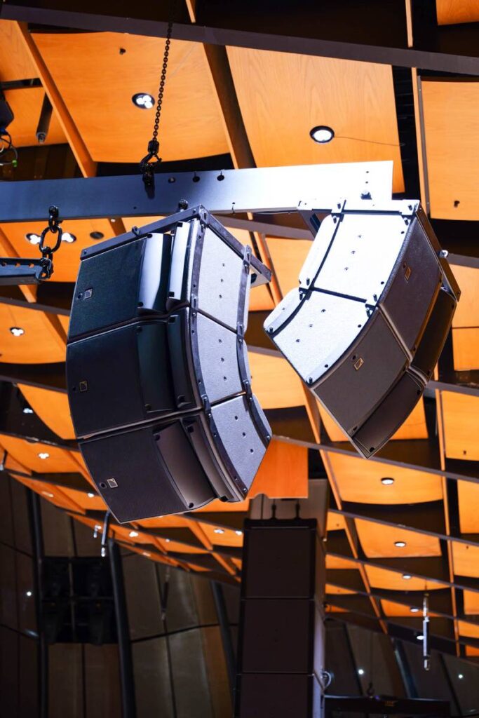 The final installation showcases the versatility of L-Acoustics L Series. The main PA comprises one hang of L2 and L2D per side, with a center array of three KS21i subwoofers in cardioid configuration. Eight X4i are integrated into the stage edge for in-fill, while side-fill is managed with two hangs of one A10i Focus over two A10i Wide. Under-balcony coverage is handled by 12 X6i speakers while one A10i Focus and one A10i Wide per side, deliver sound to seating behind the stage. Six LA7.16i amplified controllers power the complete system.