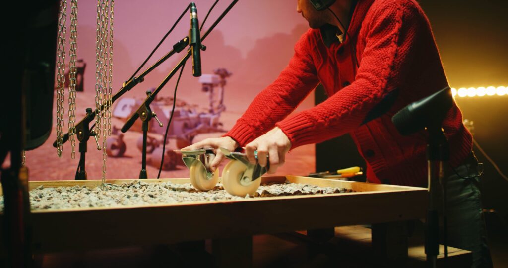 To simulate footsteps on snow, a foley artist might crush cornstarch inside a leather pouch. To mimic bones breaking, they might snap celery or frozen lettuce. Rain might be recreated using rice on a tin sheet, and fire crackles with cellophane. The goal isn’t to replicate the sound exactly as it occurs in nature, but to evoke the feeling of that sound in a way that complements the visual narrative.